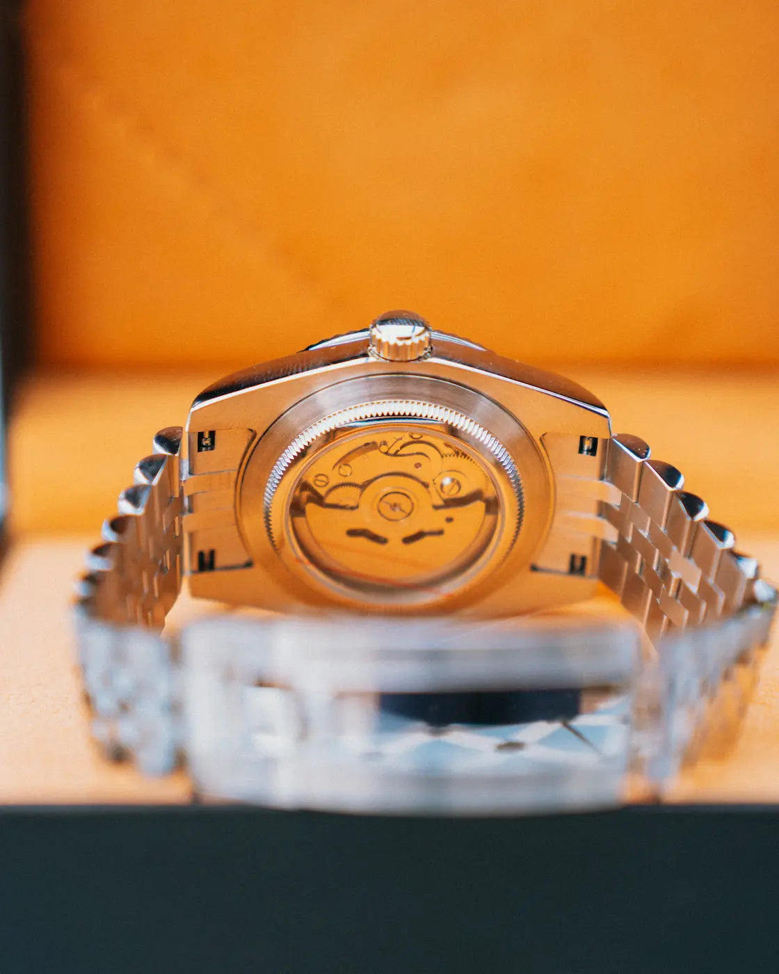 Olive Classique destila los códigos de un clásico reloj con fecha de 39 mm en un registro mediterráneo refinado. Una esfera verde oliva con acabado sunburst, bisel estriado y brazalete de cinco eslabones enmarcan el fiable movimiento automático NH35, con parada de segundero y cuerda manual. Proporciones atemporales concebidas para el uso diario.