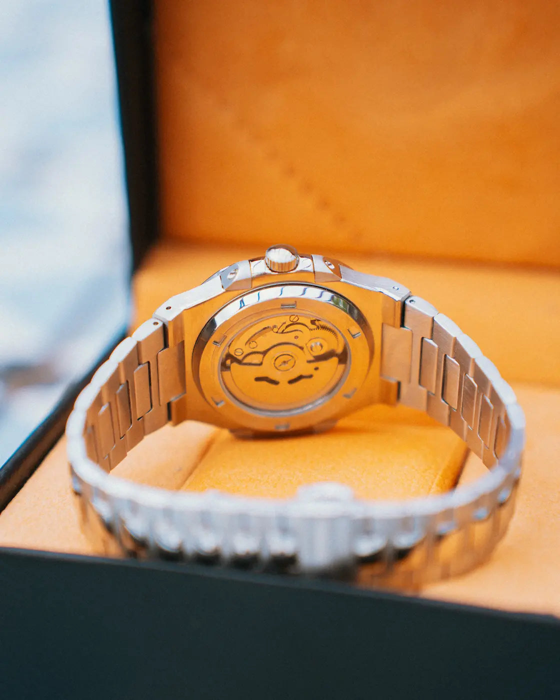 Pelagus Navy combina una caja integrada de 41 mm con una esfera azul marino a rayas. Acero 316L, cristal de zafiro con antirreflejos, corona roscada. Automático NH35, fecha a las 3 en punto, brazalete de eslabones macizos, 3 ATM: versatilidad para el día a día.