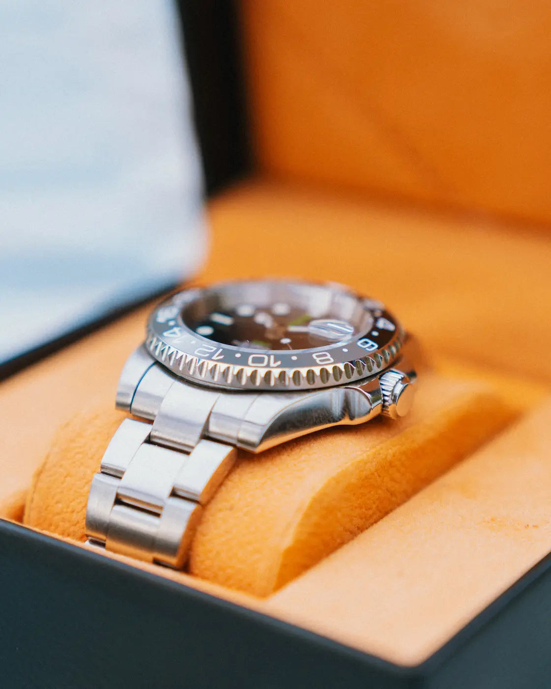 • Bisel de 24 horas: Usa el bisel cerámico de 24 h junto con la aguja GMT para leer un tercer huso horario: alinea el triángulo con el desfase deseado.