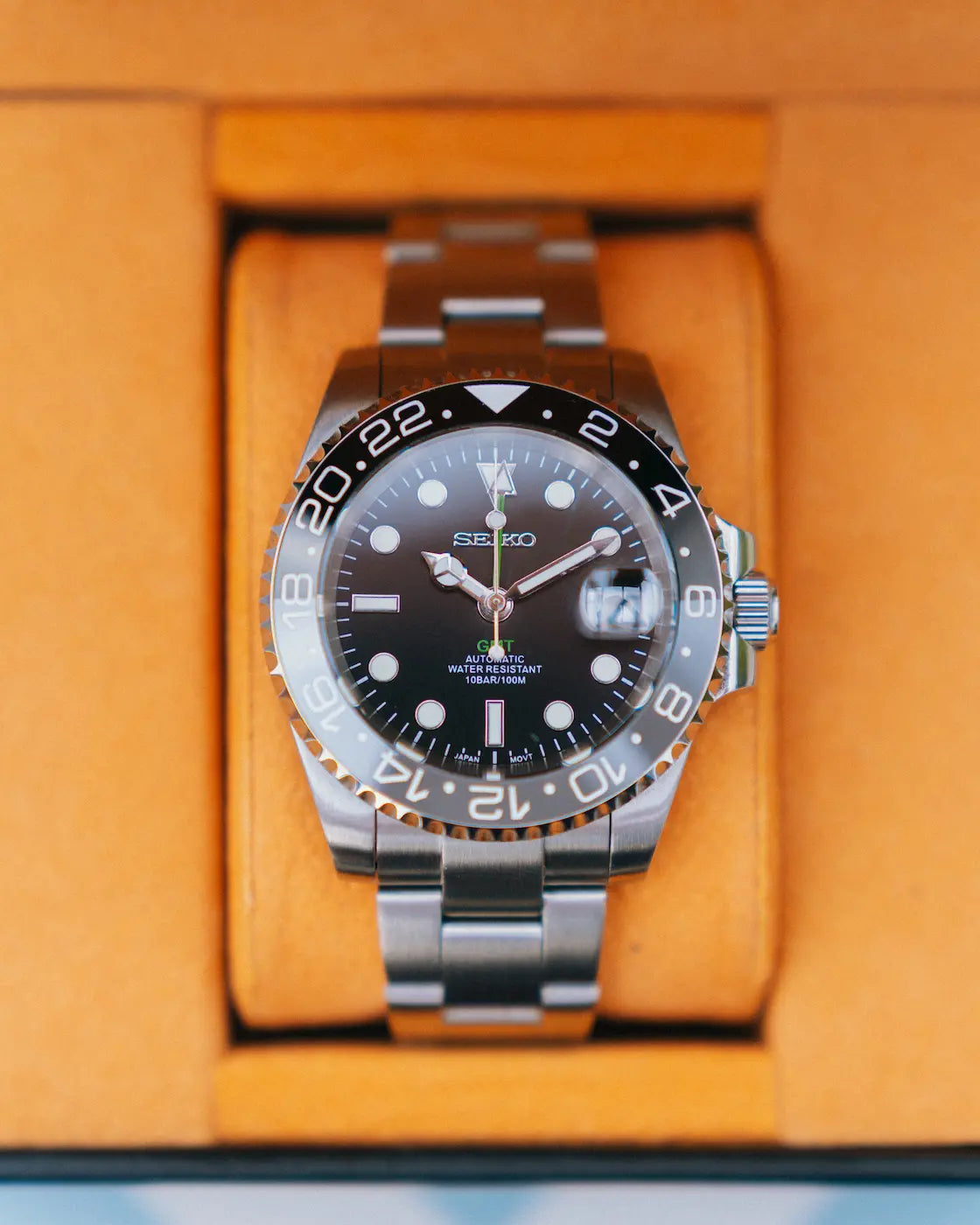 • Calibre: Seiko NH34 automático (GMT), 24 rubíes, 21.600 a/h, ~41 h de reserva de marcha.